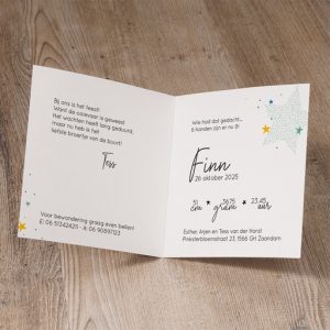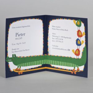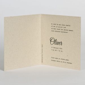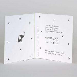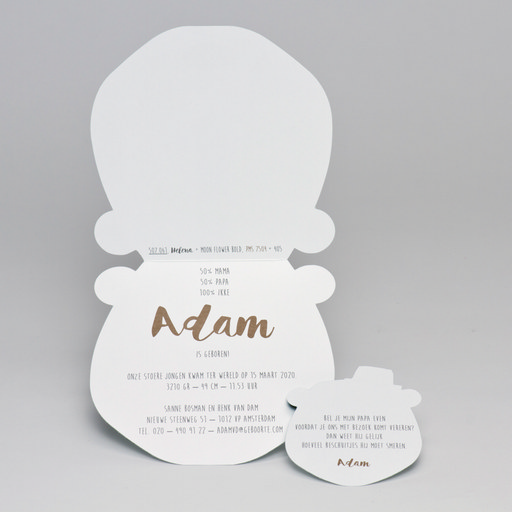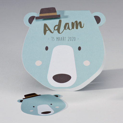 Deze geboortekaart in unieke vorm zal ongetwijfeld familie en vrienden charmeren. De naam van jullie kleintje staat vooraan gedrukt. Werk af met het speelse hoedje.Bij deze kaart wordt standaard een klein kaartje meegeleverd, ook in de aparte vorm van de berensnoet. Ideaal als uitnodiging voor babyborrel, doopfeest of om een cadeautip op te vermelden. Formaat: 120 x 120 mm Artikelnummer: 507061