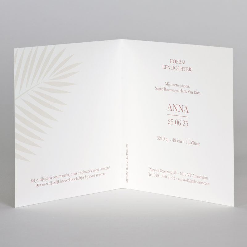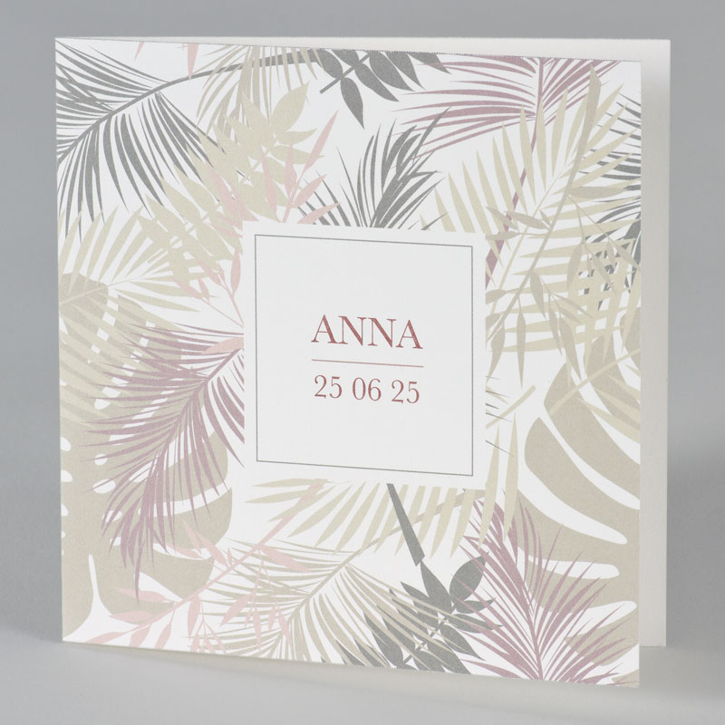 Vierkant geboortekaartje in bohemianstijl in roze en grijze tinten. In het kader in het midden is plaats voorzien voor de naam van het kindje. Fleur je kaartje op met een gekleurd envelopje naar keuze zonder meerprijs. Formaat: 12 x 12 cm Artikelnummer: 589022
