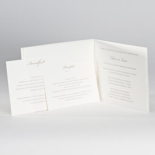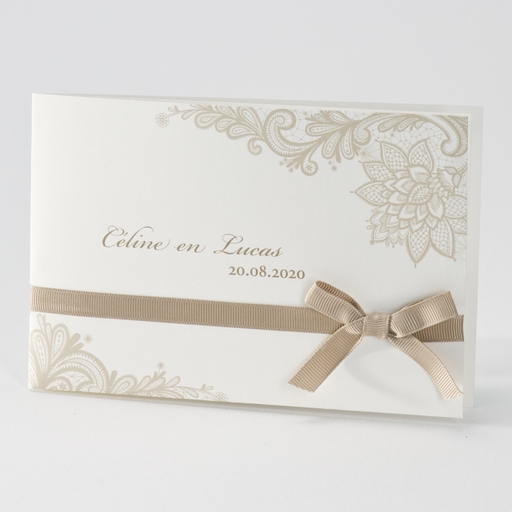 Dubbele trouwkaart met sierlijk kantmotief en breed beige luxe lint. Formaat: 115 x 175 mm Artikelnummer: 106065