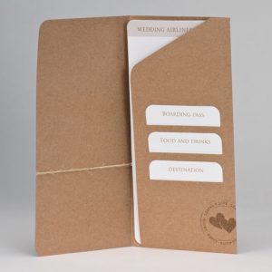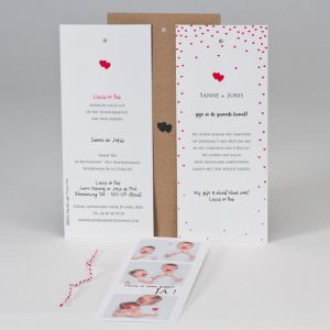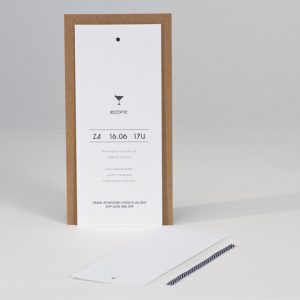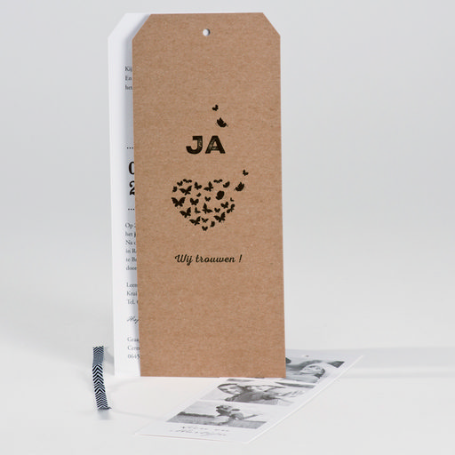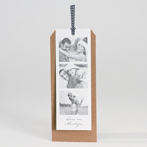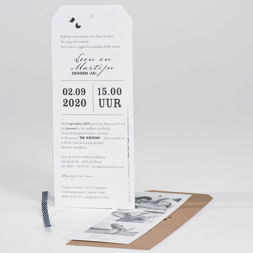 Geef je huwelijkskaart een persoonlijke toets met je mooiste en meest romantische foto's! Met deze uitnodiging zullen familie en vrienden staan popelen om de dag van jullie dromen te komen mee beleven. Het witte papier en bruin eco karton zorgen voor een perfecte harmonie. Het zwart-wit gestreept lint houdt het geheel samen. Formaat: 85 x 210 mm Artikelnummer: 106138