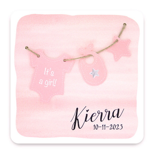 Trendy geboortekaartje met mintgroen aquarel achtergrond en waslijn met verschillende elementjes. Deze kaart is ook in mintgroen beschikbaar. Formaat: 13 x 13 cm Artikelnummer: 66731