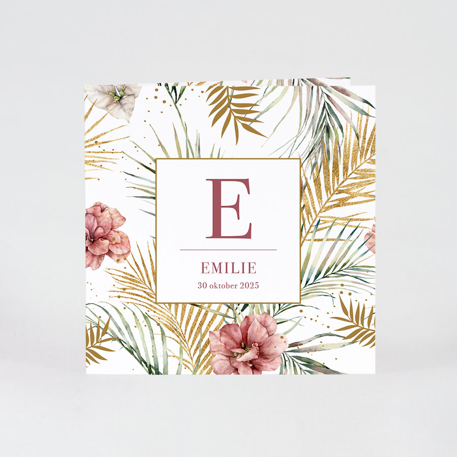 Vierkant geboortekaartje in floralprint met prachtige details in goudfolie. De naam van jullie kindje schittert helemaal centraal op de voorzijde van de kaart. Familie en vrienden zullen aangenaam verrast zijn dit geboortekaartje met het heugelijke nieuws in de bus te ontvangen.Wij bedrukken de kaarten snel en goedkoop in onze eigen drukkerij. Onze ontwerpers maken een gratis gepersonaliseerde digitale proefdruk en wij drukken de kaarten pas na uw akkoord. De prijs is inclusief enveloppen. Formaat: 12 x 12 cm Artikelnummer: 581059