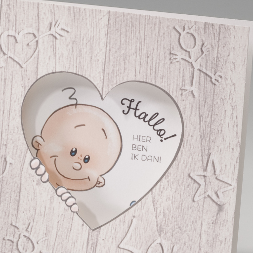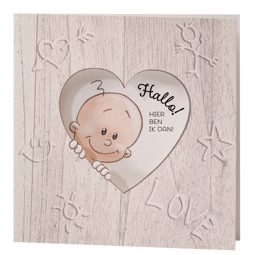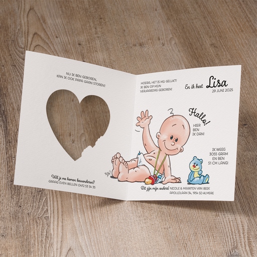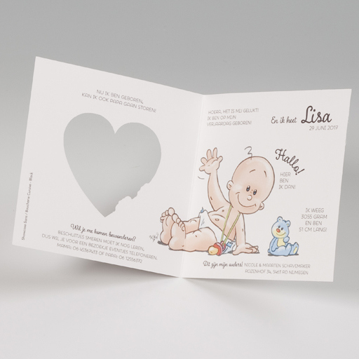 Grappig geboortekaartje met stans in hartvorm Dit geboortekaartje is gedrukt op aquarelpapier. Bij dit geboortekaartje past ook een gekleurde envelop naar keuze. Geboortekaartjes - 610053 (610053N) - 12.0 cm x 12.0 cm