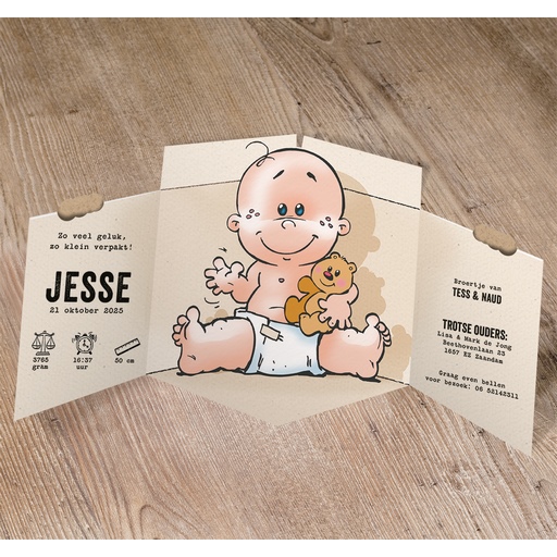 Origineel babykaartje met een verrassend leuk effect als de doos geopend wordt Kaartje van aquarelpapier dat gevouwen wordt als doosje. Geboortekaartjes - 610009 (610009N) - 13.5 cm x 13.5 cm