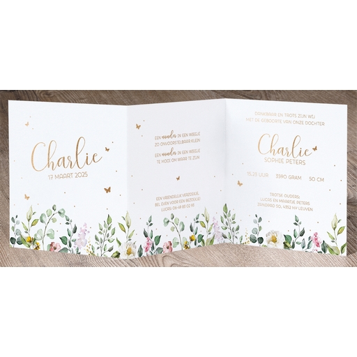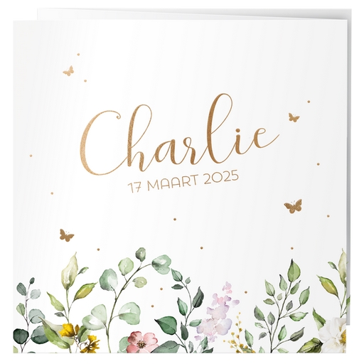 Romantisch geboortekaartje met bloemen en vlindersLief drieluik geboortekaartje op mat papier met aquarel takjes en blaadjes. In goudfoliedruk: de naam van jullie kindje, vlinders en stipjes. Bij dit kaartje rekenen wij geen extra drukkosten voor het bedrukken van de naam van jullie kindje met goudfolie. Je betaalt dus enkel de standaard drukkosten. Geboortekaartjes - 610046 (610046N) - 12.0 cm x 12.0 cm