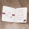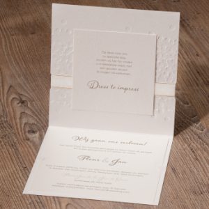 Elegante aankondiging met gouden bloemen.Chique kaart met bloemenprint in parelmoer, goud en mooi bordeaux. Door de verrassende binnenzijde en het satijn lint krijgt deze kaart een extra romantische touch.Kaart bestaat uit verschillende onderdelen. Uitnodigingen - 620024 - 15.4 cm x 15.4 cm