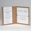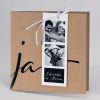 Huwelijksuitnodiging in bruin papier met leuke fotostrip vooraan. Op de strip is plaats voorzien voor jullie mooiste foto of foto's. De JA op de pochette is reeds voorgedrukt in zwarte folie. De kaartjes worden door middel van een wit lint aan de kaart bevestigd. Formaat: 154 x 154 mm Artikelnummer: 108906
