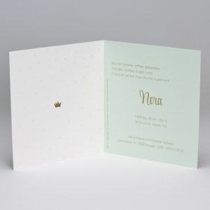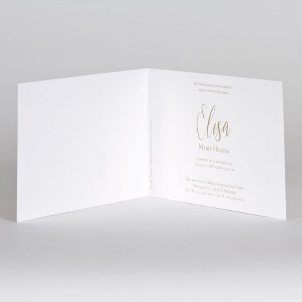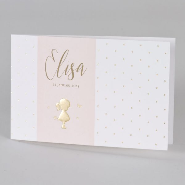 Langwerpig geboortekaartje met silhouet meisje en stipjes in goudfolie