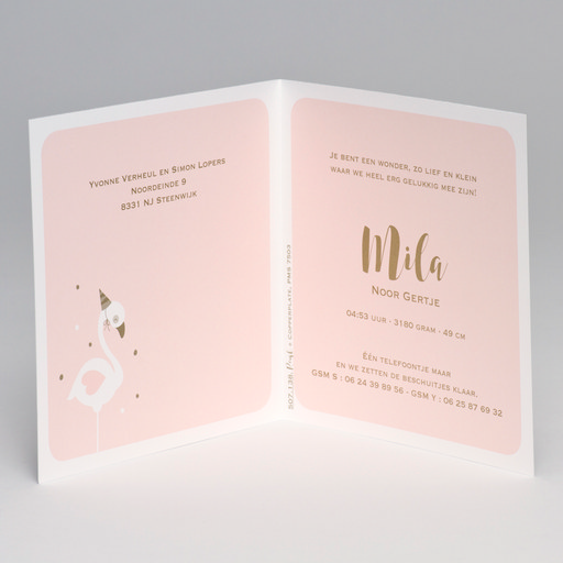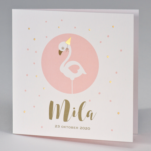 De flamingo heeft een feesthoedje op en de confetti vliegt in het rond, want er is een klein meisje geboren! De gouden confetti is voorzien van goudfolie, wat deze kaart nog wat extra glamour bezorgt. De naam van jullie kleine meid pronkt helemaal vooraan. Formaat: 120 x 120 mm Artikelnummer: 507138