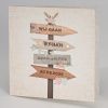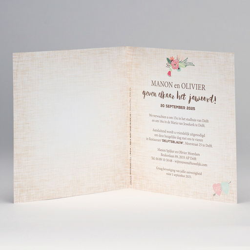 Trendy trouwkaart met houten wegwijzers en romantische details. De hartjes, de knopjes van de bloemen bovenaan en het woord LOVE is in goudfolie gedrukt. Formaat: 154 x 154 mm Artikelnummer: 108024