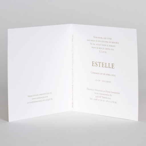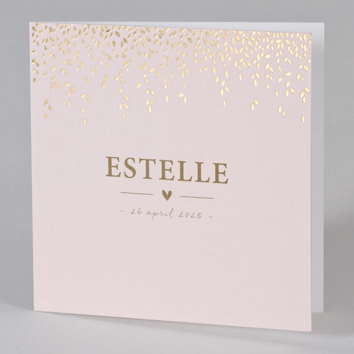 Een softroze geboortekaartje met blaadjes in goudfolie. Formaat: 120 x 120 mm Artikelnummer: 589001