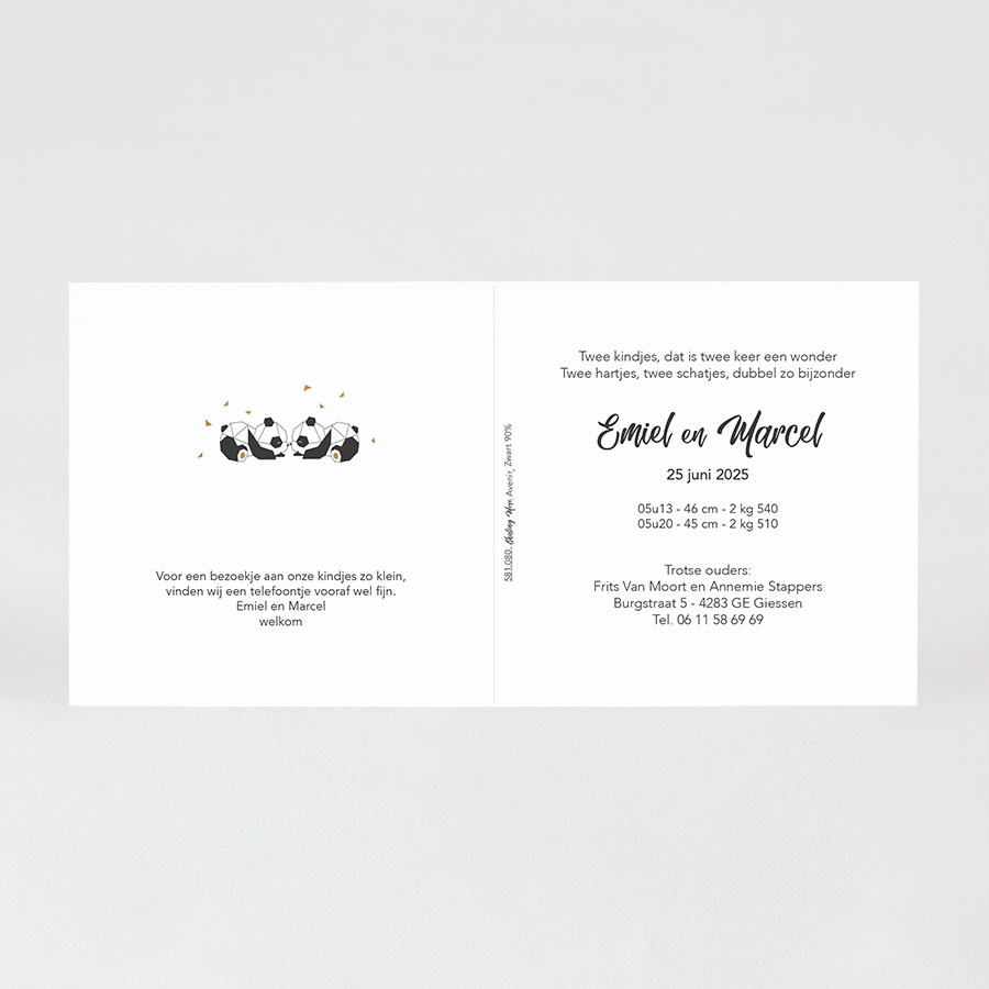 Onze topper is nu eveneens verkrijgbaar voor tweelingen. Hoe schattig, deze 2 panda's. De details in koperfolie zorgen voor een feestlijk effect aan deze kaart.Ook verkrijgbaar voor 1 kindje : 589.096.Wij bedrukken de kaarten snel en goedkoop in onze eigen drukkerij. Onze ontwerpers maken een gratis gepersonaliseerde digitale proefdruk en wij drukken de kaarten pas na uw akkoord. De prijs is inclusief enveloppen. Formaat: 12 x 12 cm Artikelnummer: 581080