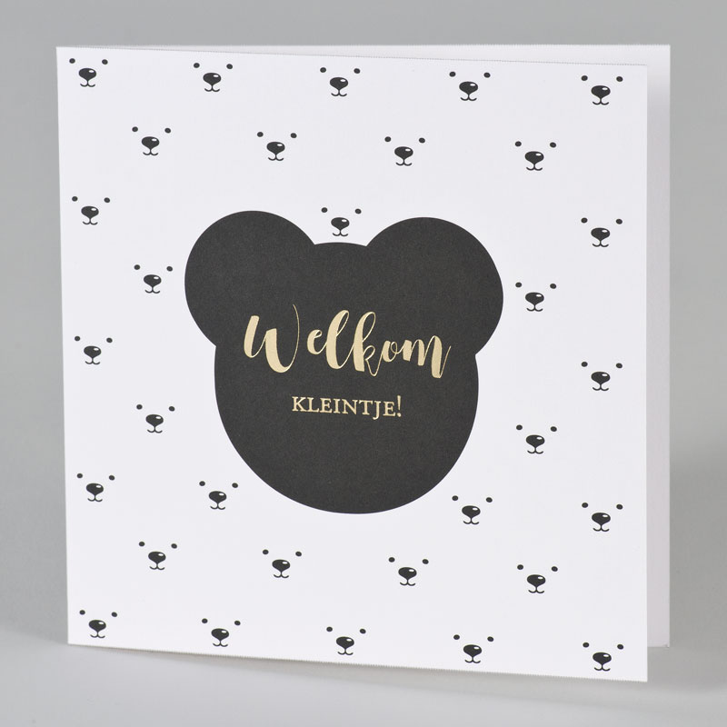 Zwart/wit geboortekaartje met berenkop en goudfolie