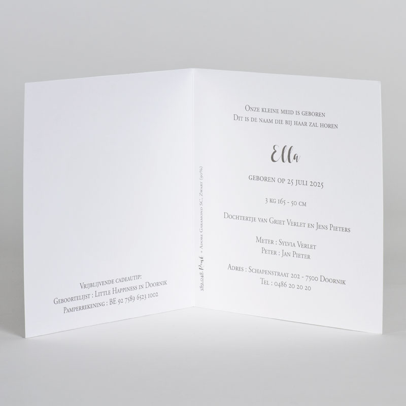 Strakke geboortekaart in zwart, wit en goud. De tekst Welkom Kleintje is reeds voorgedrukt in goudfolie. De kaart wordt aan de buitenzijde versierd met lieflijke berensnoeten. Fleur je kaartje op met een gekleurd envelopje naar keuze zonder meerprijs. Formaat: 12 x 12 cm Artikelnummer: 589048